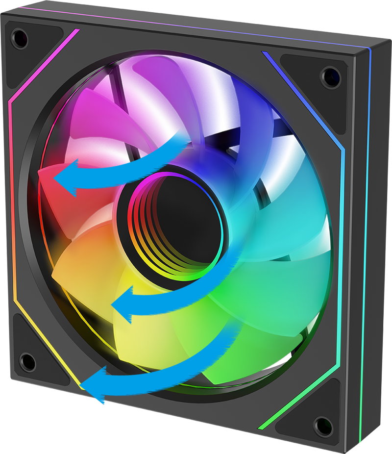 The airflow is directed from the rear to the front, making it ideal for mounting on the top of the PSU tunnel or on the side panel of the PC case.