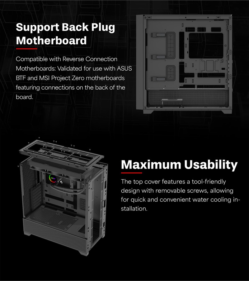 A well-designed cable management system keeps the interior clean, supports back-plug motherboard connections, and ensures optimal airflow.